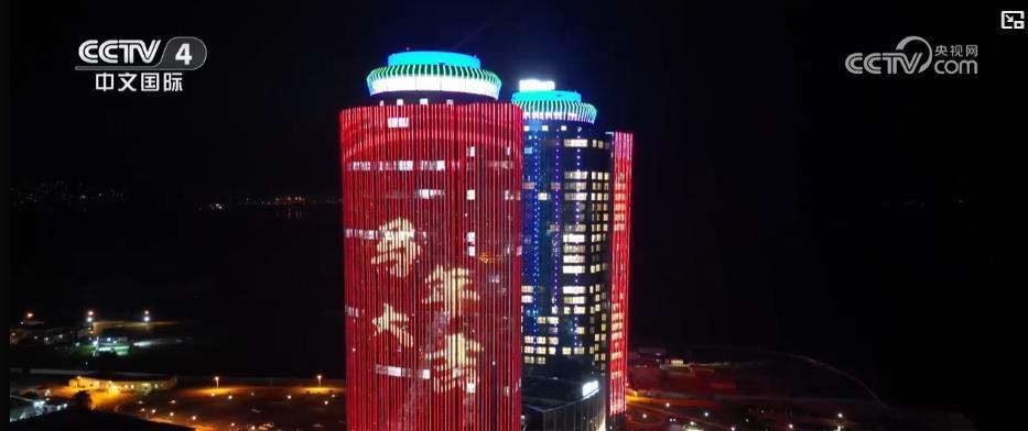 在刚果(布),布拉柴维尔商务中心和沿河大道斜拉桥同时披上红色盛装。在新西兰奥克兰,“万马奔腾”艺术光影秀亮相地标建筑天空塔,欢庆马年春节。