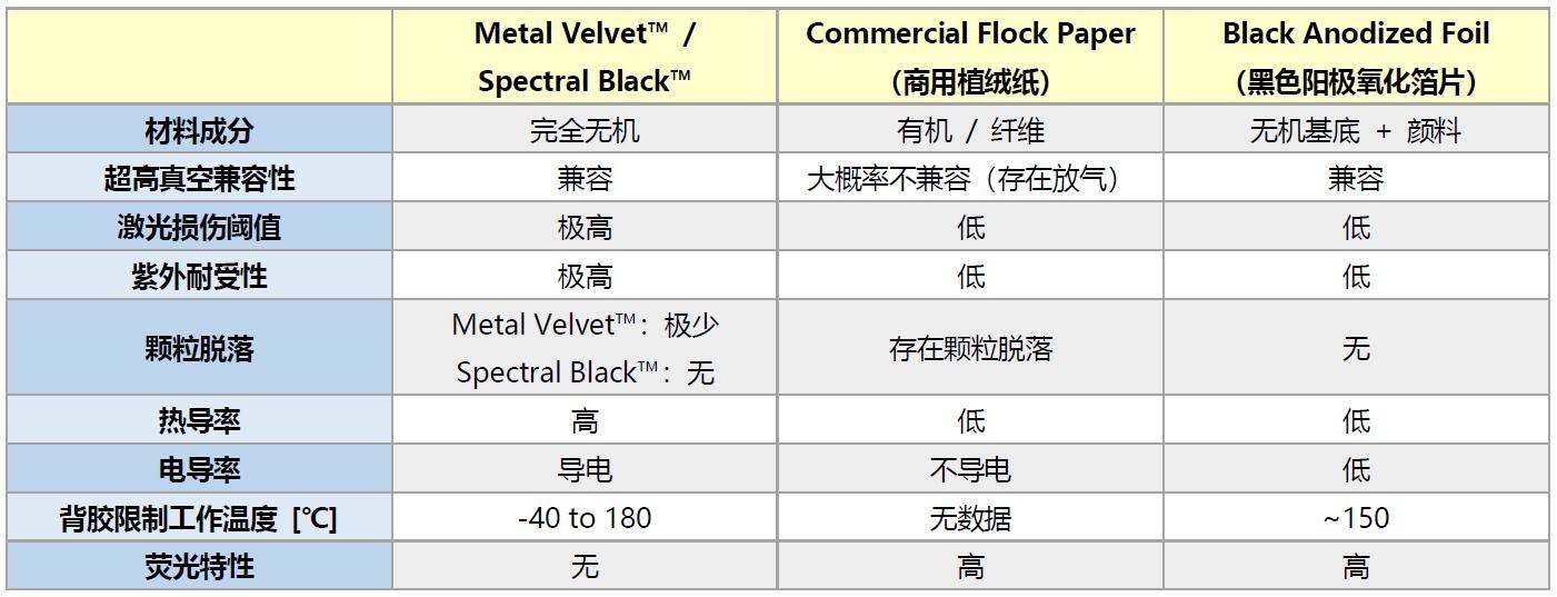 • Acktar:极高的耐受性,且热导率高,能有效耗散激光能量。