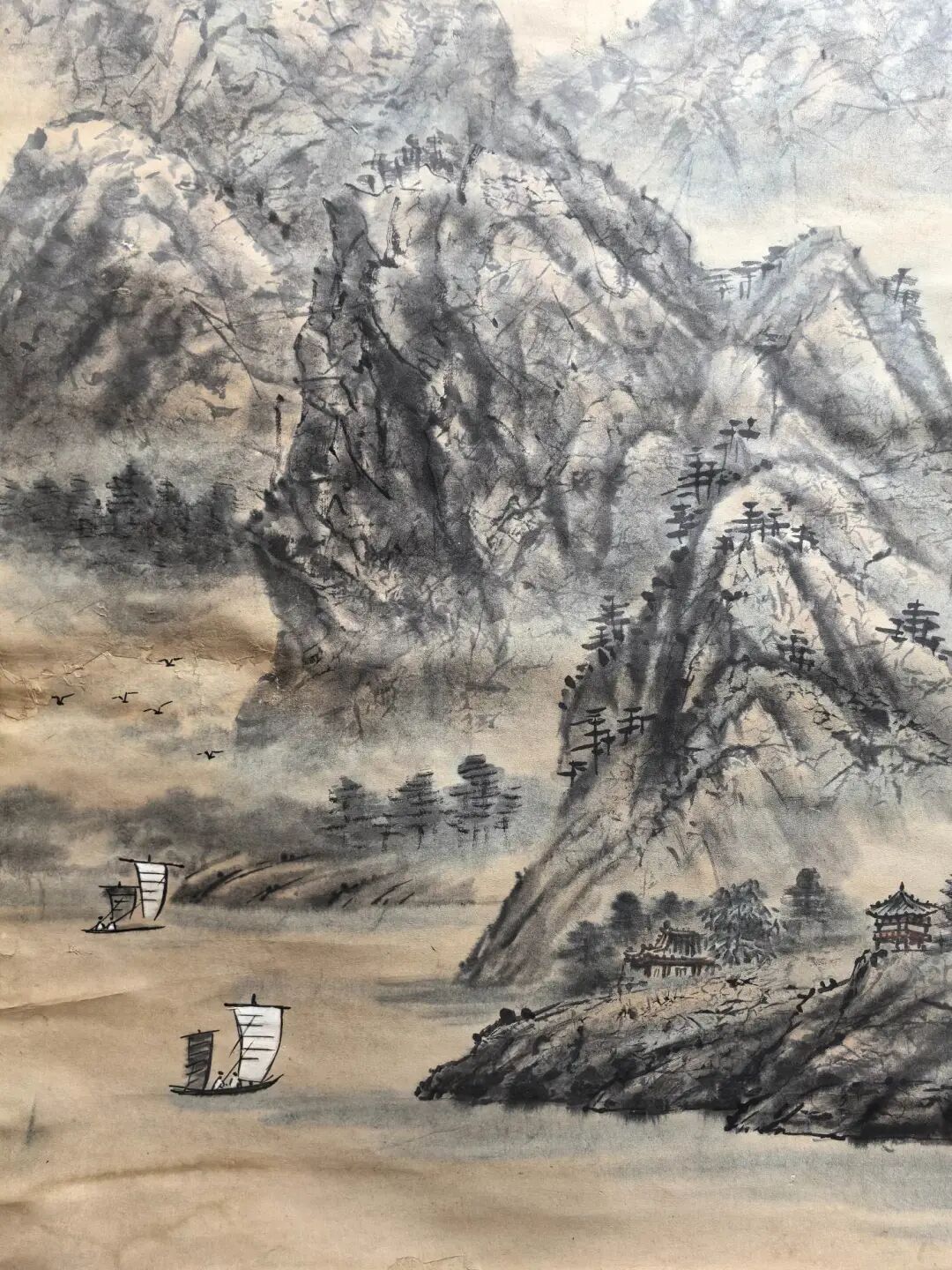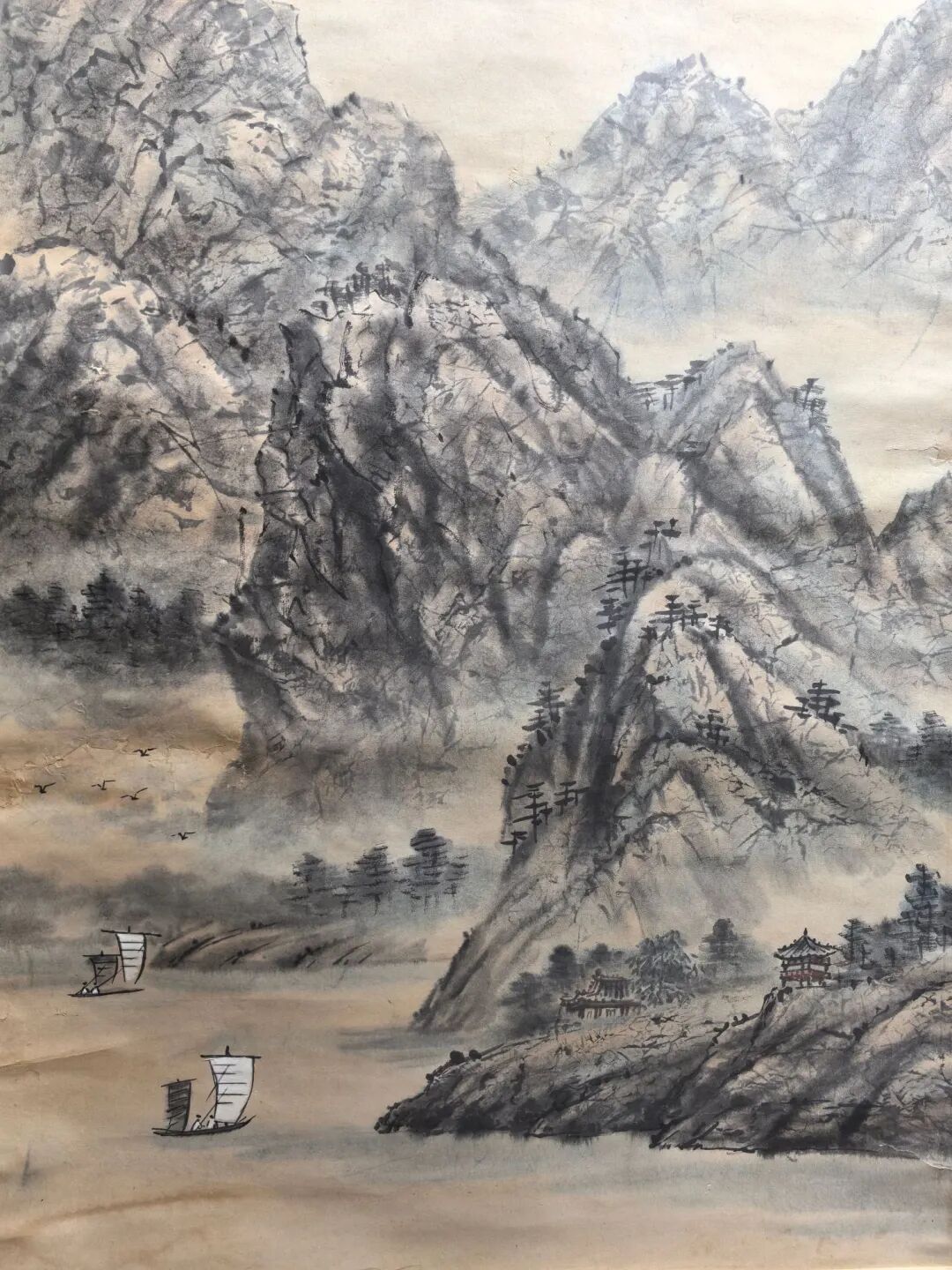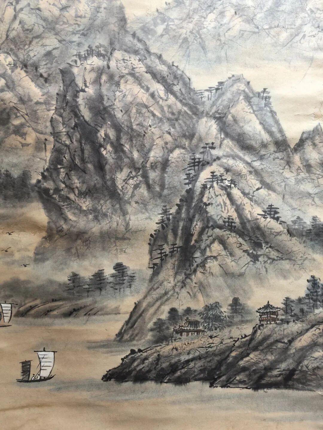 傅抱石画这画时,估计心里憋着股气——他早年在重庆金刚坡住过,三峡的险峰急流见过太多,可他偏不画“苦大仇深”,反而用泼墨的“乱”衬出小舟的“稳”。你看那山峰泼墨由浓转淡,像人生从艰难到开阔;河流从窄变宽,暗喻“熬过去就是坦途”。右上角的房舍更妙,藏在山林里,像是给“闯过万重山”的人留的温馨归处。