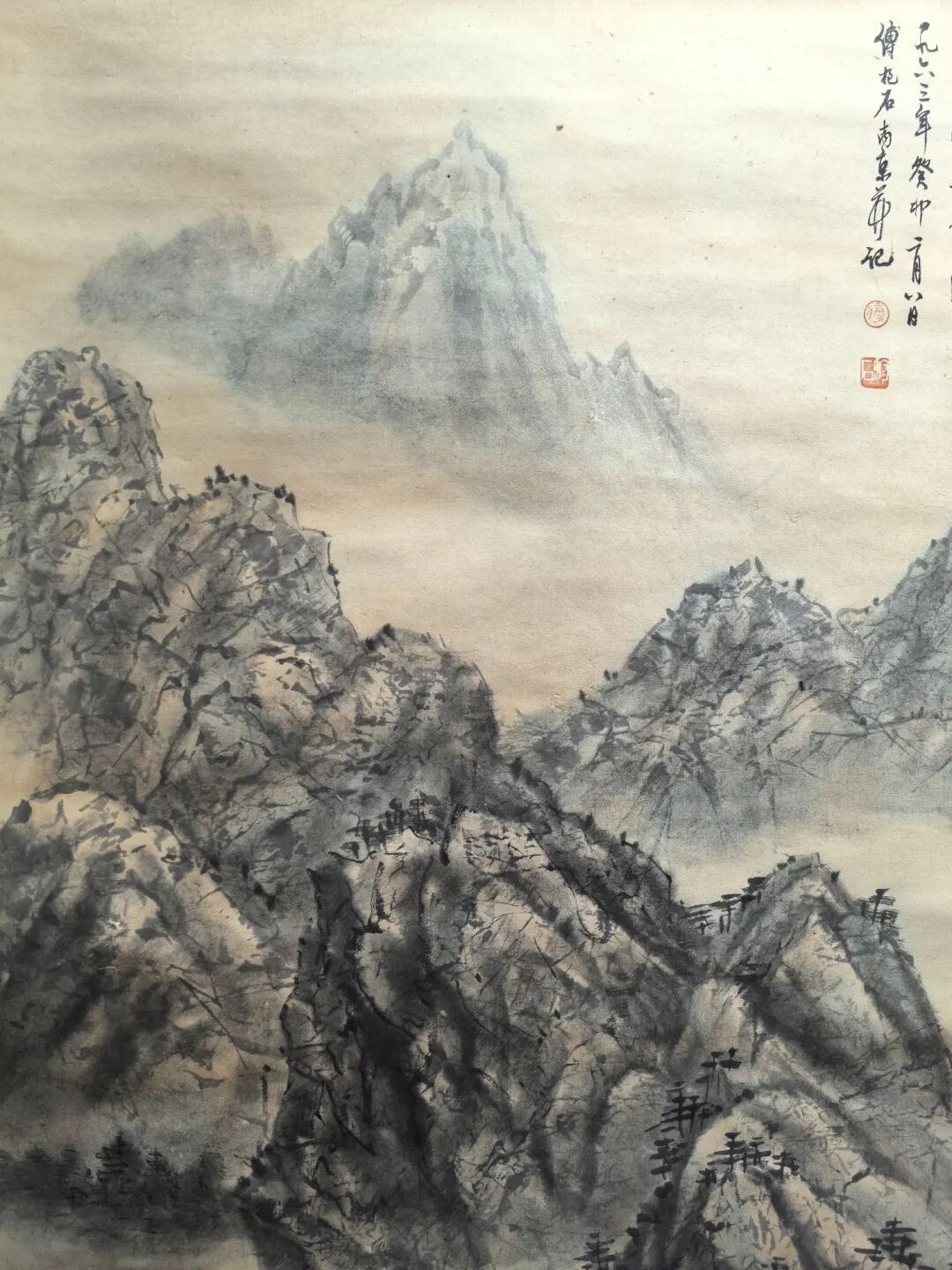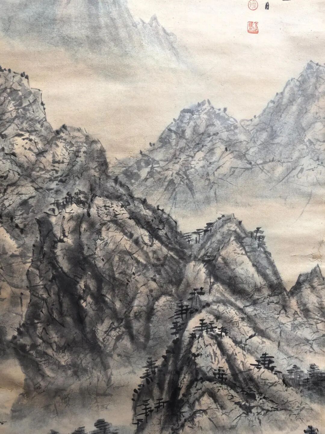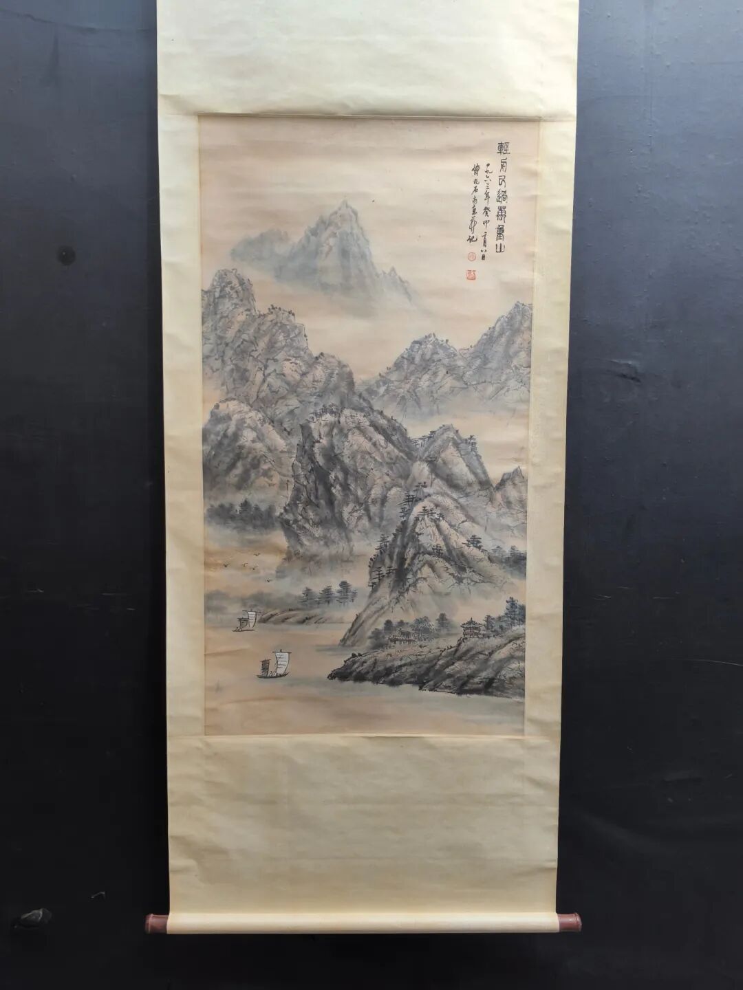 傅抱石画这画时,估计心里憋着股气——他早年在重庆金刚坡住过,三峡的险峰急流见过太多,可他偏不画“苦大仇深”,反而用泼墨的“乱”衬出小舟的“稳”。你看那山峰泼墨由浓转淡,像人生从艰难到开阔;河流从窄变宽,暗喻“熬过去就是坦途”。右上角的房舍更妙,藏在山林里,像是给“闯过万重山”的人留的温馨归处。