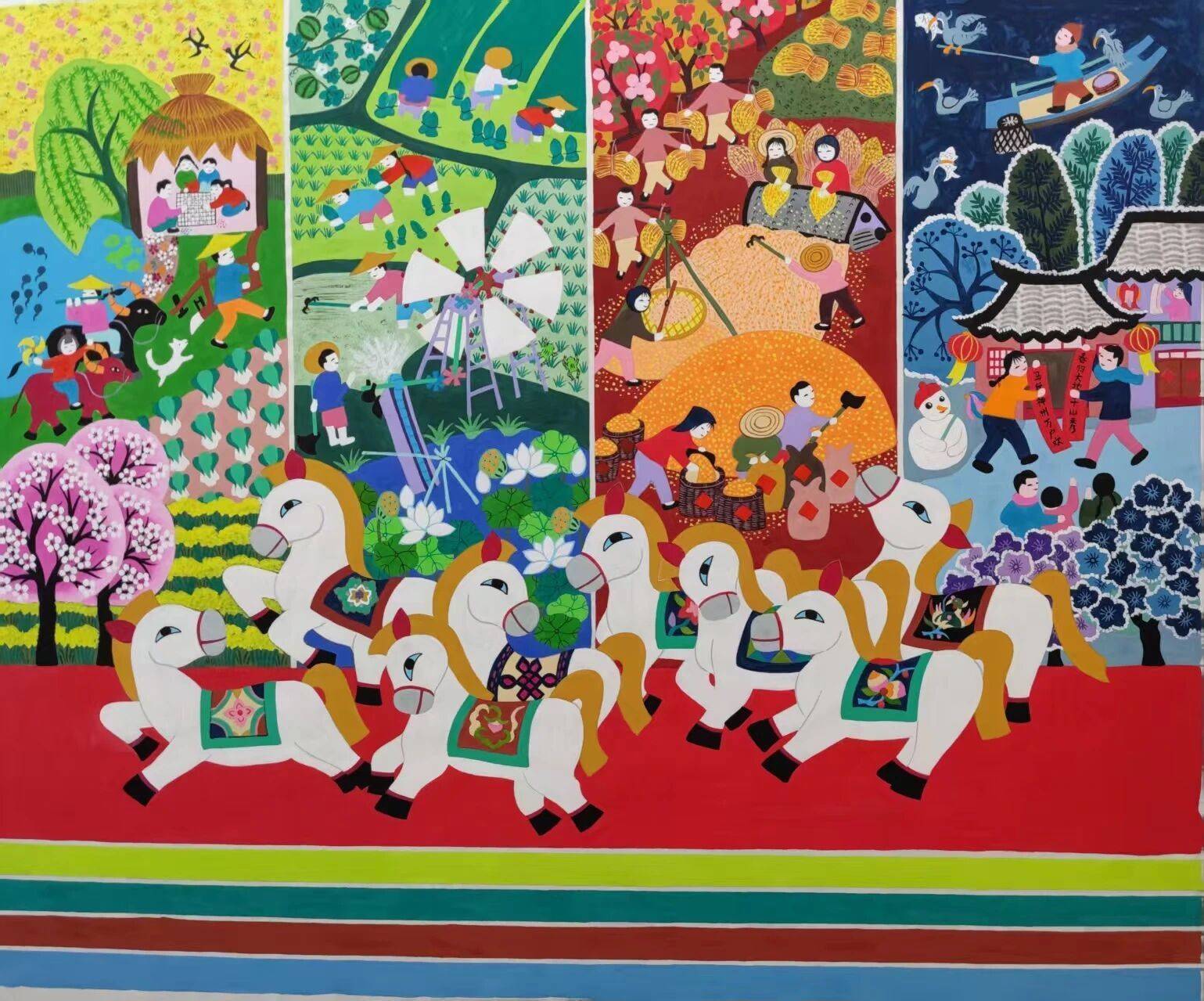 眼前这幅《八骏循时图》,出自金山农民画画家陈惠方之手。画中八匹骏马神态迥异、灵动飞扬,或奔腾跃动、或缓步前行,身后牵引出四季农事的流转,春耕、夏种、秋收、冬藏,蕴含着岁月轮回、生生不息的农耕智慧与人文情怀。陈惠方告诉记者,这幅作品是她创作生涯中尤为难忘的一笔,为这幅画构思的版本不少于十版,有好几个晚上甚至到深夜12点多,望着空白的画纸,她心里满是焦虑。某天凌晨2点半,她突然惊醒,脑海中豁然浮现出马的造型,最终她决定用民间美术来呈现。