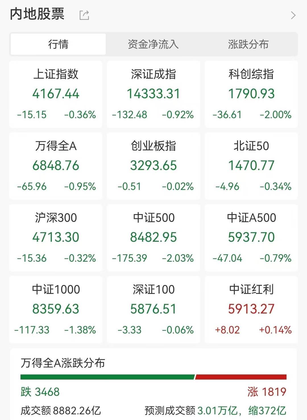 【大河财立方消息】3月3日,A股高开回落,指数集体翻绿。截至发稿,沪指跌0.36%,深证成指跌0.92%,科创综指跌2%,创业板指跌0.02%,创业板指此前一度涨超1%。沪深北三市实时成交额8882.26亿元,全市场3468只个股下跌。