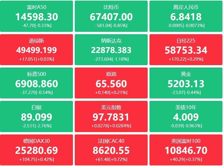 期货:现货黄金涨0.41%报5186.18美元,黄金期货跌0.45%报5202.80美元;现货白银跌0.88%报88.4490美元,白银期货跌2.74%报89.120美元;铜期货跌0.28%报6.0280美元,现货铂金跌0.22%,现货钯金跌0.63%;原油期货跌0.21美元,跌幅0.32%报65.21美元,布伦特原油报70.75美元;天然气期货报2.8270美元,汽油期货报2.0323美元,取暖油期货报2.6125美元。
