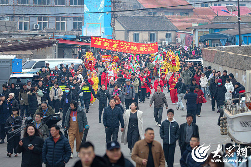 早上9点,山后初家村委大院传来一声长喝。由海阳大秧歌、舞龙、锣鼓组成的巡游队伍,浩浩荡荡地向初旺渔港码头进发。近一公里的村道上,身着五彩服饰的演员们手执彩绸,扭出了正月里最浓烈的红火。码头边,数十艘渔船一字排开,船头红旗猎猎,等待着一年一度最重要的仪式。