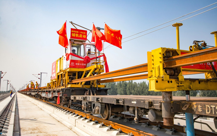 9月1日,雄商高铁全线正式进入铺轨阶段,工作人员在河北省河间市施工。图/新华社